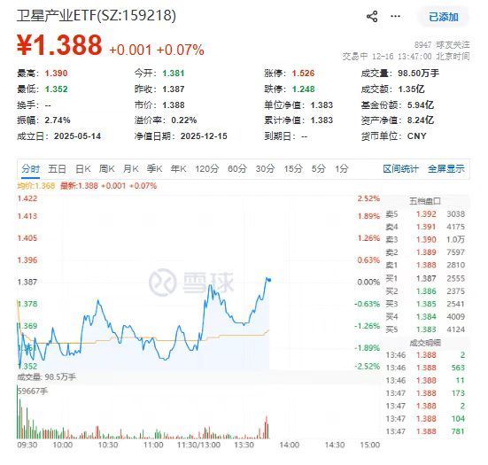 12月16日,卫星板块午后再度异动拉升。截至13时48分,卫星产业ETF(159218)强势翻红。成分股航天电子涨停、四维图新、卓胜微涨幅居前;交投持续升温,换手率达16.78%配资专业炒股投资,成交额约1.4亿,连续第9日成交过亿!